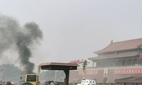 Police investigating Monday's car crash at Beijing's Forbidden City are searching for information on two suspects from the Muslim Uighur minority. A day after a car ploughed through a crowd, crashed and burst into flames, killing five people and injuring 38, government sources have said the "major incident" may have been a suicide attack.